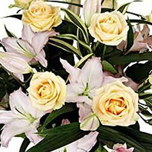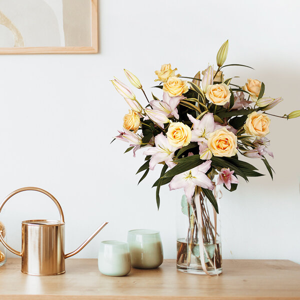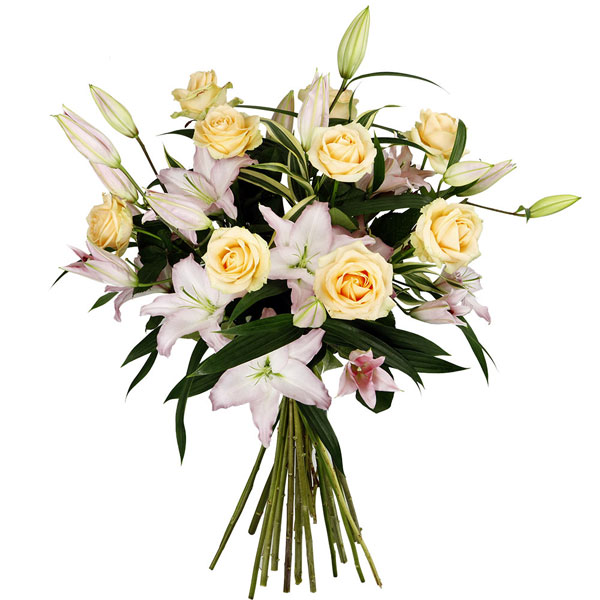 Bouquet longues tiges dans les tons rose et crème composé de lys, roses et feuillages.