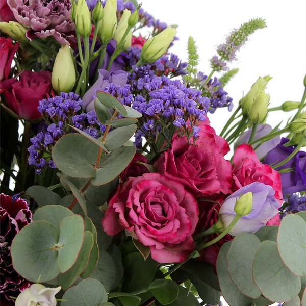 Bouquet dans les tons violets et roses, composé de roses, lisianthus, œillets et de feuillage.