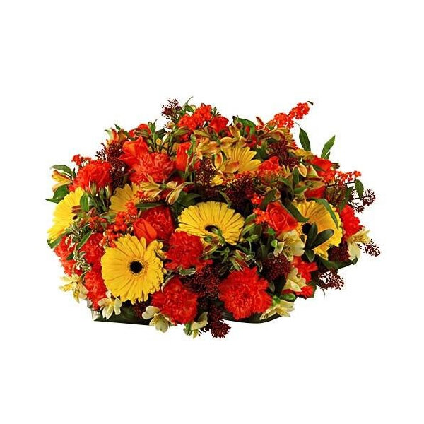 Coussin rond dans les tons rouges, orange et jaunes composé d'oeillets, germinis, roses et autres fleurs.
