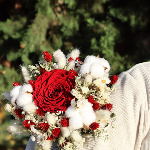 Plongez au cœur d'un hiver enchanteur avec ce magnifique bouquet éternel, où chaque élément semble murmurer une histoire. En son cœur, une rose stabilisée d’un rouge profond règne avec élégance, symbole vibrant de passion, lovée dans un écrin de fleurs de coton aussi pures que la neige. Autour, dansent gracieusement des fleurs séchées aux textures délicates et aux nuances subtiles. Un cadeau parfait pour exprimer vos sentiments les plus profonds à l'occasion des fêtes de fin d'année.