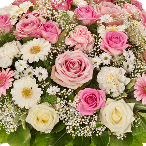On y trouve des roses roses et blanches, des santinis blancs et des œillets blancs, choisis pour leur symbolique de respect. Quelques petites fleurs légères et du feuillage vert complètent l'ensemble et donnent du relief à la composition.