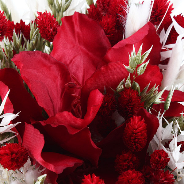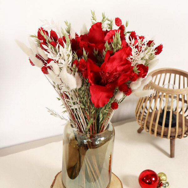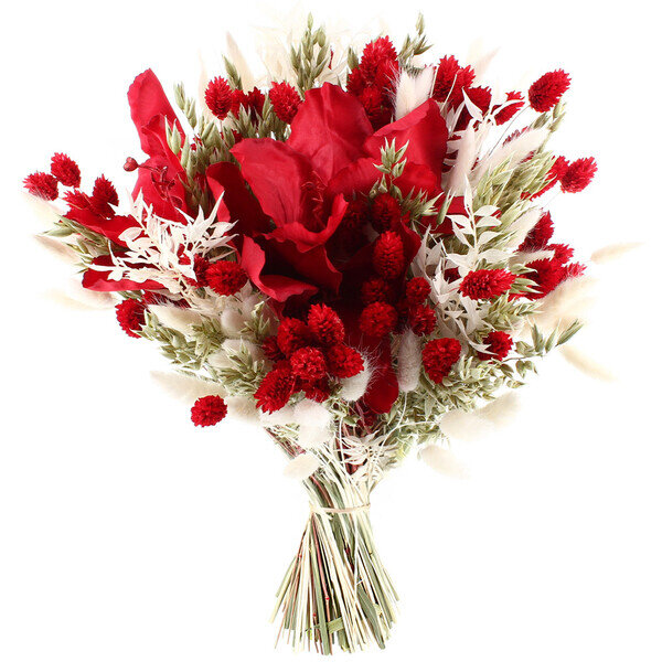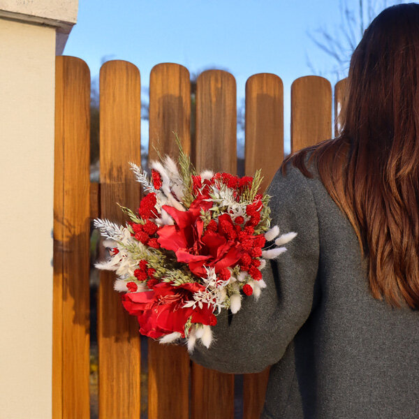 Le contraste saute aux yeux : une amaryllis rouge en soie qui vient trancher dans un nuage tout doux de fleurs séchées. Cette fleur emblématique de l'hiver et des fêtes de fin d'année apporte ce côté chaleureux et festif qu'on aime tant en cette saison. Nous avons joué sur les textures naturelles, du ruscus au lagurus, pour créer ce look bohème et brut qui plaît beaucoup. Plus qu'un simple bouquet, c'est une vraie pièce déco qui dure dans le temps, attrape la lumière et garde son allure sans jamais faner. Cette touche de rouge puissant dans un écrin crème réchauffe n'importe quel intérieur pendant les longs mois d'hiver.