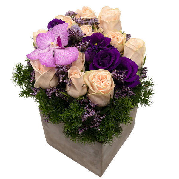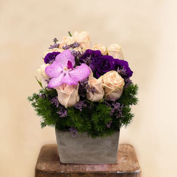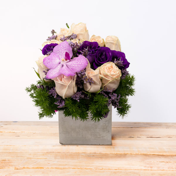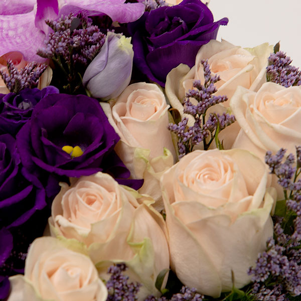 Composition piquée dans les tons violets et rose pâle composée de roses et autres fleurs de saison. Le contenant peut varier en fonction des disponibilités chez le fleuriste.