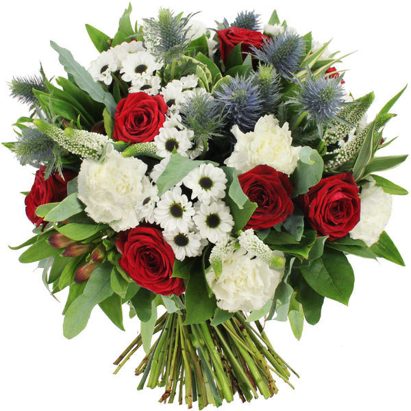 Bouquet rond dans les tons blanc, rouge et vert composé de roses, oeillets, chardons, fleurettes et feuillages.