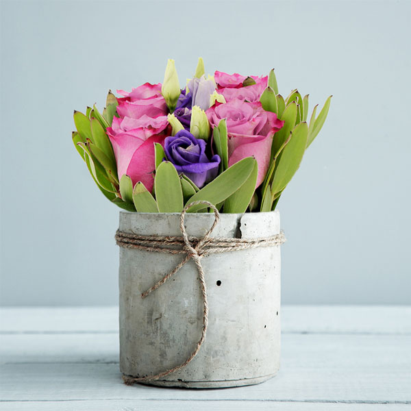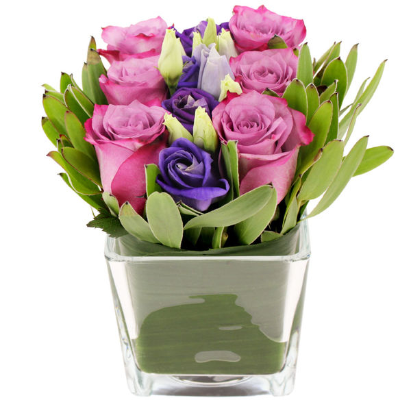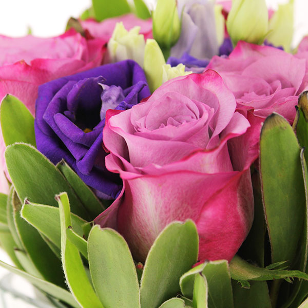 Composition piquée dans les tons rose et violet dans son contenant, avec roses et fleurs de saison (le contenant peut varier en fonction des disponibilités).