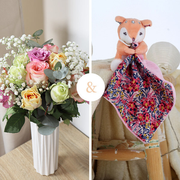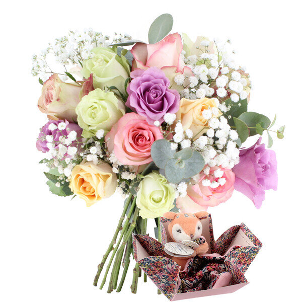 Pour célébrer l'arrivée d'un nouveau-né, offrez aux parents, un magnifique bouquet de 15 roses pastel, délicatement accompagné de gypsophile et d'eucalyptus. Complétez ce cadeau élégant en y ajoutant un doudou rose, spécialement conçu pour apporter douceur et réconfort au tout-petit. Présenté dans une boite assortie, elle deviendra un endroit précieux pour conserver les souvenirs de la naissance.
