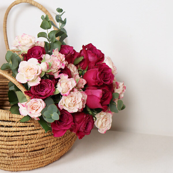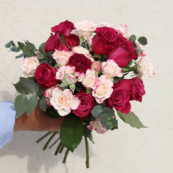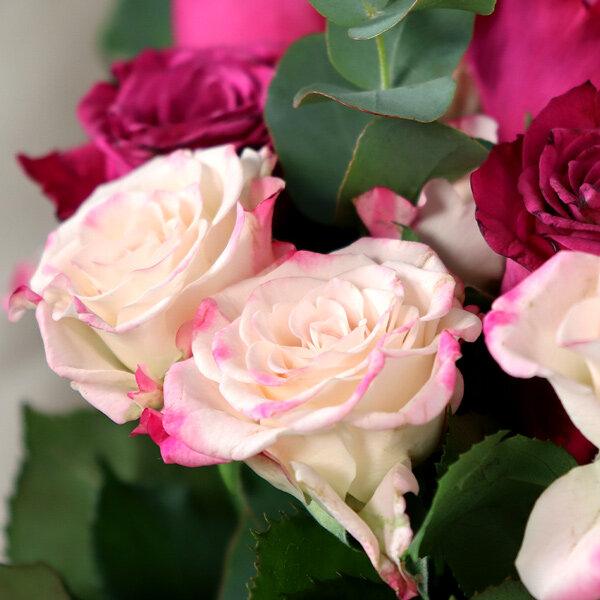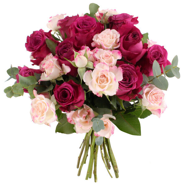 Laissez-vous séduire par ce généreux bouquet qui marie à merveille l'intensité du fuchsia et la douceur des teintes pastel. Composé de 25 roses soigneusement sélectionnées, cet arrangement floral exprime toute la délicatesse de vos sentiments. Les branches d'eucalyptus apportent une touche de fraîcheur et de naturel qui sublime l'ensemble. Parfait pour une déclaration d'amour, un anniversaire ou simplement pour faire plaisir, ce bouquet romantique saura conquérir les cœurs les plus exigeants.