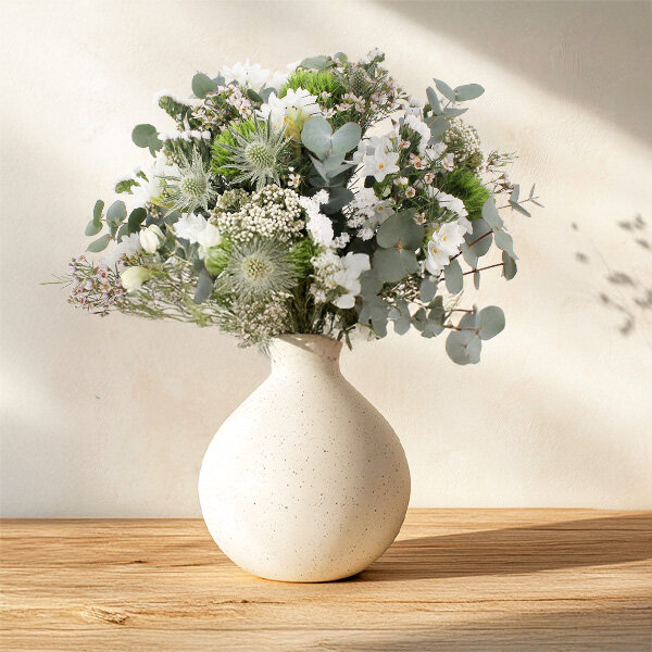 C'est le temps du printemps, le temps des journées légères et des fleurs fraîches qui éclosent. Ce bouquet champêtre dans les tons blancs capture parfaitement cette atmosphère printanière, évoquant la pureté et la douceur de la saison. Composé de narcisses et de délicates fleurettes de saison, il incarne la beauté éphémère de la nature en floraison. Accompagné de feuillage verdoyant, il offre une touche de fraîcheur et de vie à n'importe quel espace, rappelant les plaisirs simples du printemps.