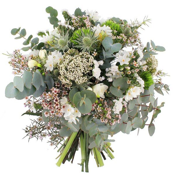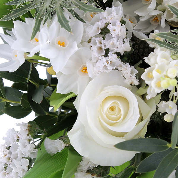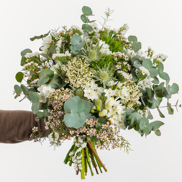Bouquet champêtre dans les tons blancs, composé de narcisses et fleurettes de saison, le tout accompagné de feuillage.