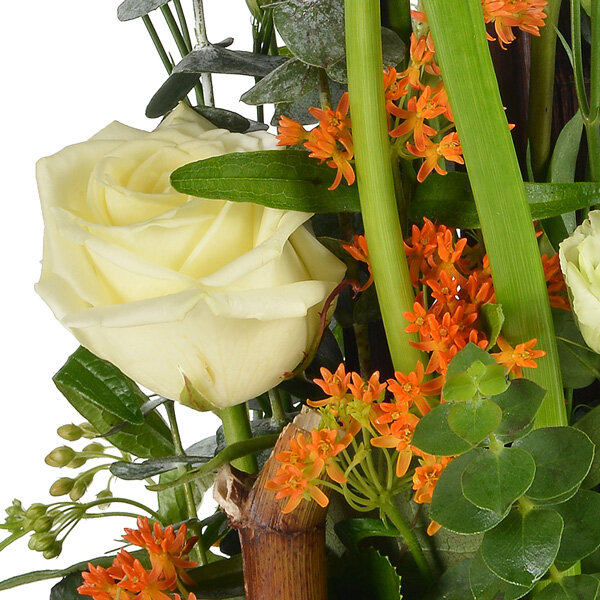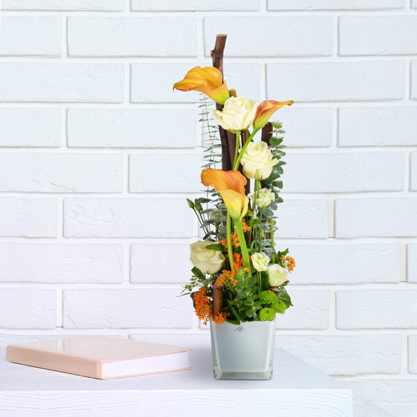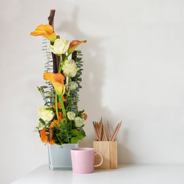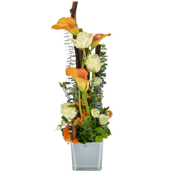 Composition moderne dans les tons orange et blanc, avec roses, arums ou callas, fleurettes de saison, branchages et feuillages, dans un contenant assorti.