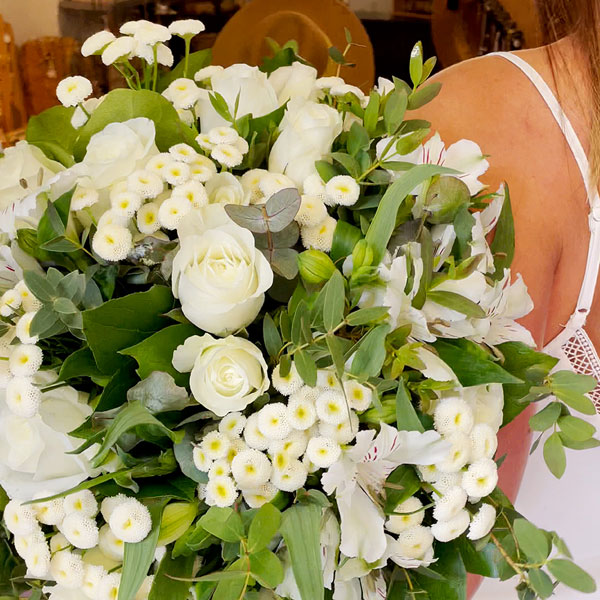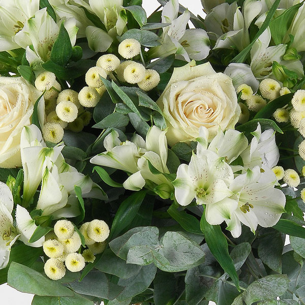 Bouquet rond dans les tons blanc et vert composé de roses, alstromérias, matricaires et feuillages.