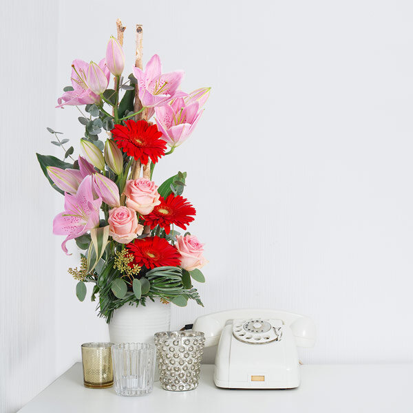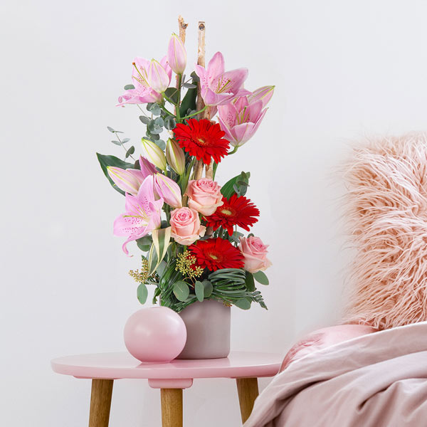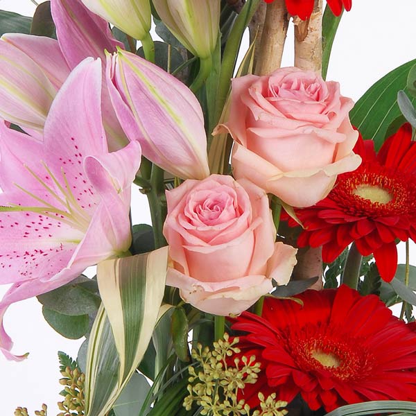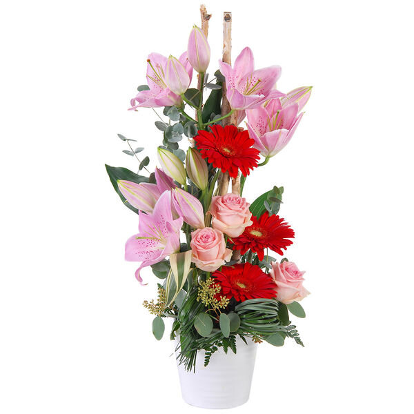 Composition en hauteur dans les tons rouge et rose composée de lys, roses, germinis et feuillages divers.