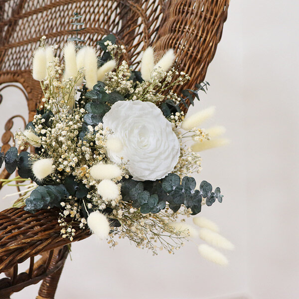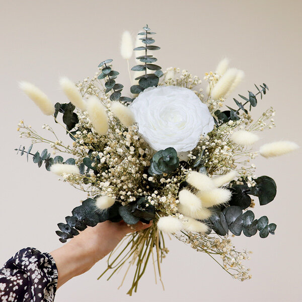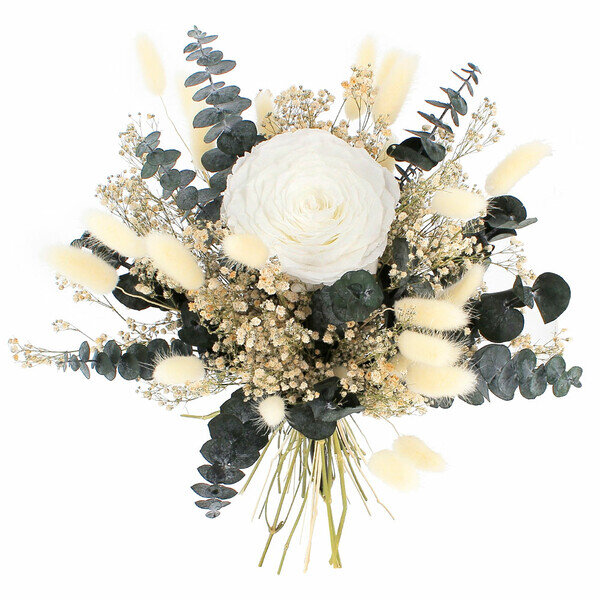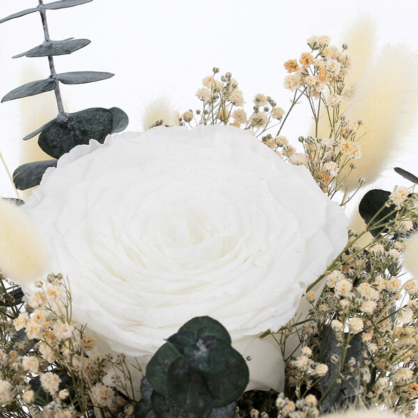 Délicate et magistrale, notre grande rose blanche stabilisée, s’enveloppe de sa brassée de fleurs séchées, pour vous offrir une subtile création florale dans les tons naturels.