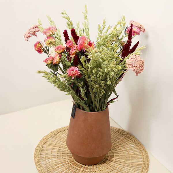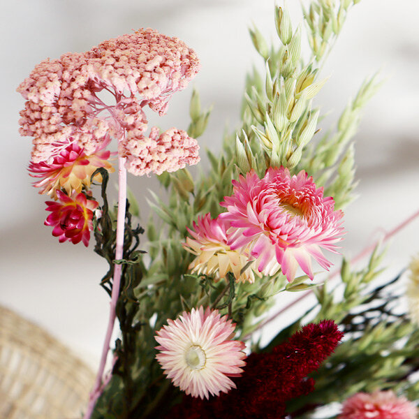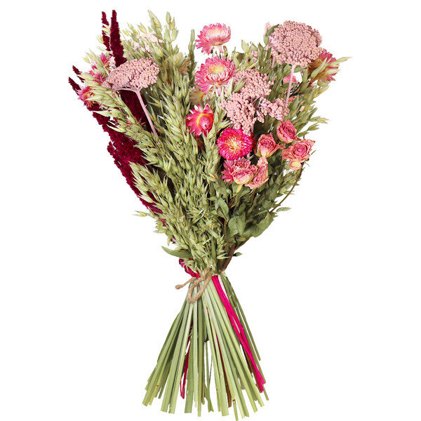 Bouquet de fleurs séchées composé d'Amaranthus, d'Avoines, d'Achillea, de Rhodanthe, d'helichrysum et de Roses. Le bouquet est prêt à l'emploi.