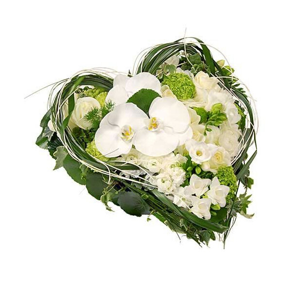 Cœur dans les tons de blanc composé de roses, de fleurs de phalaenopsis et d'autres fleurs ainsi que du feuillage.