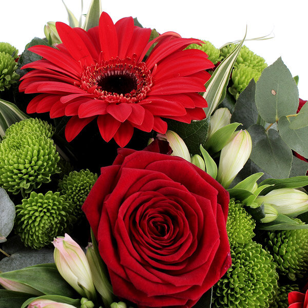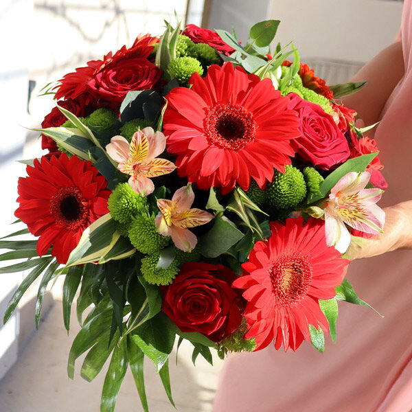 Bouquet rond dans les tons rouge, rose pâle et vert composé de roses, alstromérias, germinis et feuillages.