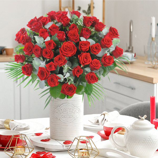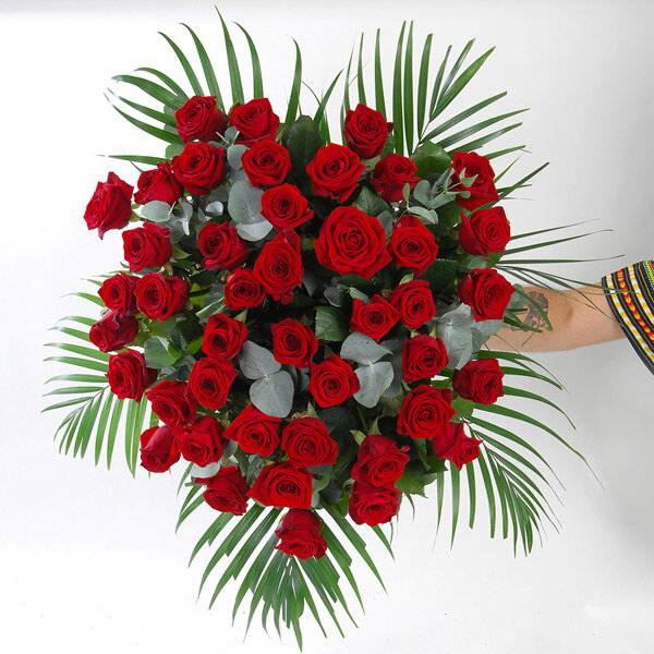 Quoi de plus que magique que cette majestueuse brassée de roses rouges ? Ce bouquet de prestige entrelaçant la magie de ces magnifiques roses rouges et la douceur de l’eucalyptus est poétique allégorie d’un amour passionnel et sincère.