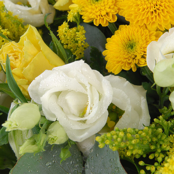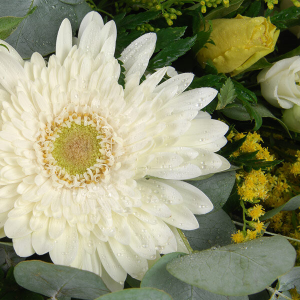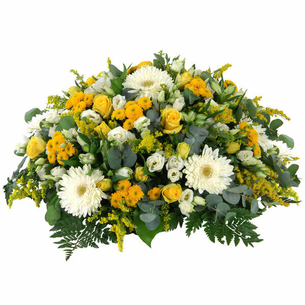 Ce coussin rond dans les tons jaune, blanc et vert rassemble harmonieusement des gerberas lumineux, des roses délicates, des lisianthus gracieux, de l'eucalyptus parfumé et d'autres feuillages naturels. Memory évoque avec douceur la pureté des souvenirs précieux qui illuminent nos cœurs endeuillés. Nos artisans fleuristes Florajet réalisent chaque composition avec un savoir-faire remarquable, alliant créativité et minutie pour sublimer chaque détail. Parfait pour fleurir une tombe ou accompagner une cérémonie funéraire, ce coussin de deuil symbolise l'espoir et la sérénité qui apaisent la douleur de l'absence. Ces fleurs aux teintes apaisantes transmettent un message de paix et célèbrent la beauté des moments partagés avec votre proche disparu.