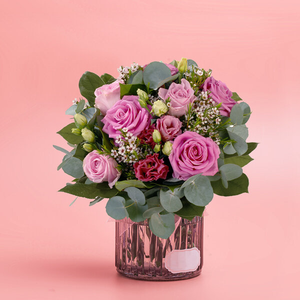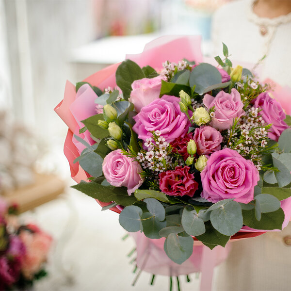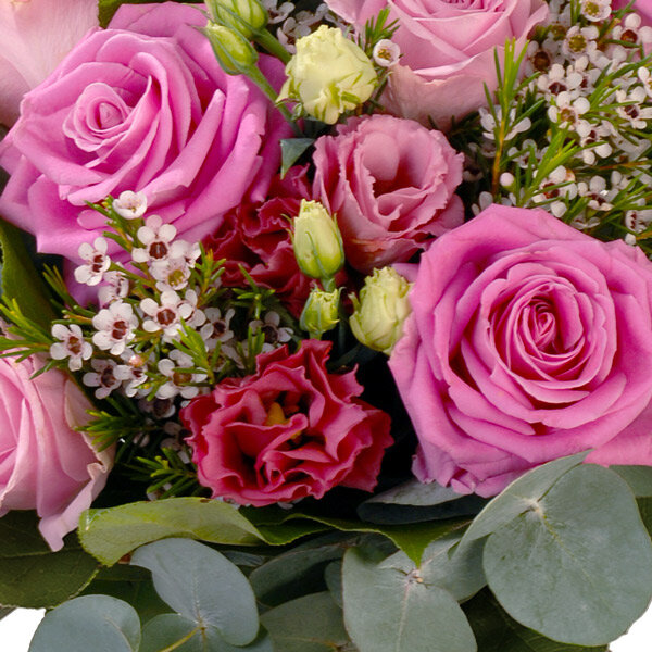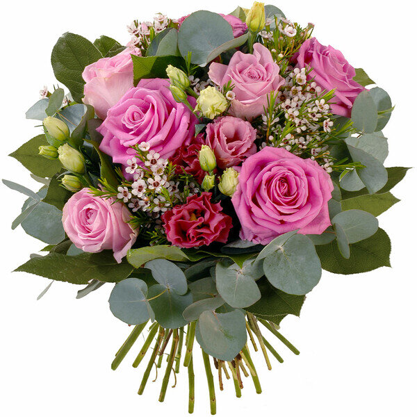 Bouquet rond dans un camaïeu de rose composé et de roses, de lisianthus et autres fleurettes de saison, le tout accompagné de feuillage.