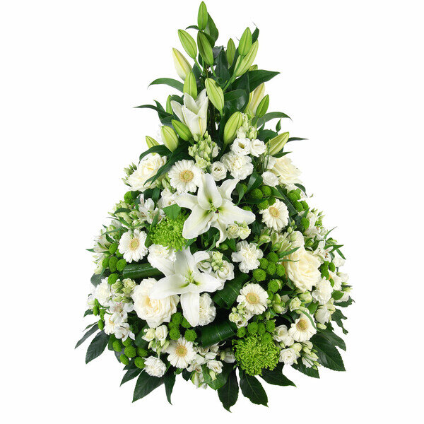 Coussin conique dans les tons blancs et verts composé de lys, germinis, oeillets et autres fleurs de saison, le tout accompagné de feuillage.