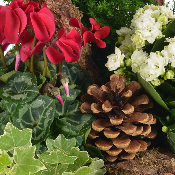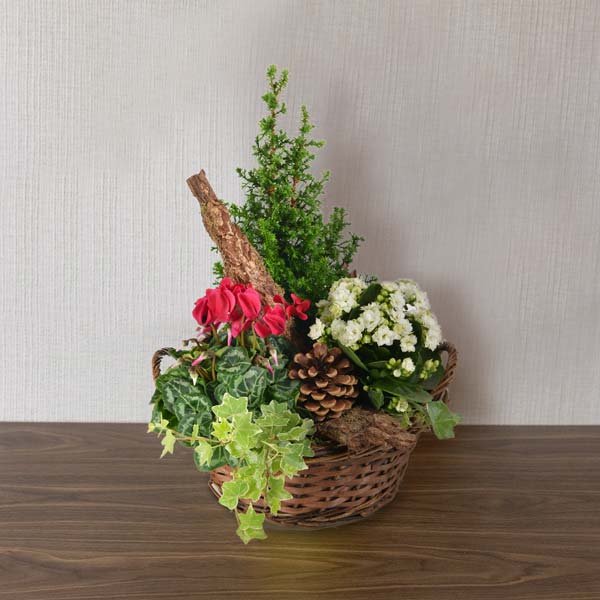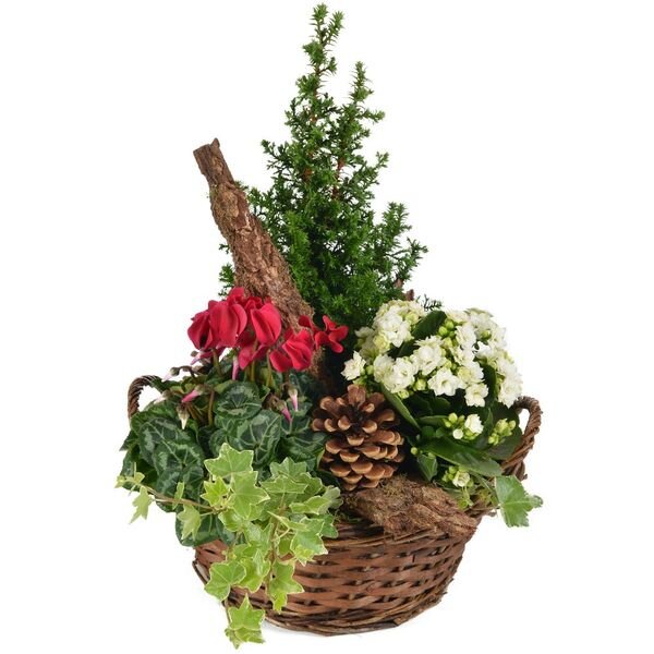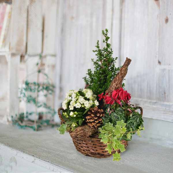 Coupe de plantes d'extérieur dans les tons de rouge, banc et vert composée d'un cyclamen, d'un kalanchoé et de plantes vertes dans un panier en osier (le contenant peut varier en fonction des disponibilités).