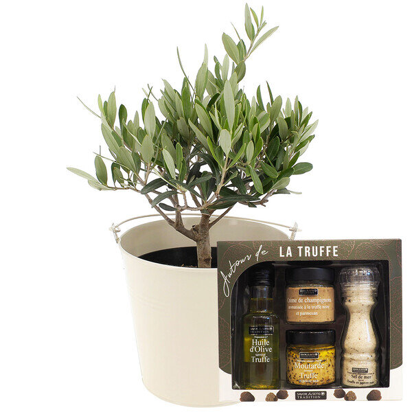 Ce coffret gourmand réunit des produits beaux, bons et bio qui illumineront vos plats en les habillant d'une légère note de truffe ; nous avons ajouté, pour que le plaisir des sens soit total, un superbe olivier. Le groupe Savor Création, référence de l’épicerie fine, met, depuis plusieurs années, son savoir-faire gastronomique au service de produits originaux, hauts en couleur et de grande qualité. Brodant sur divers univers luxueux et authentiques, la gamme bio révèle, au travers une subtile initiation des papilles, tout un monde de saveurs et de délicatesse parfumée. Une croisière initiatique à savourer subtilement.