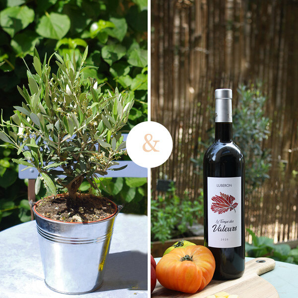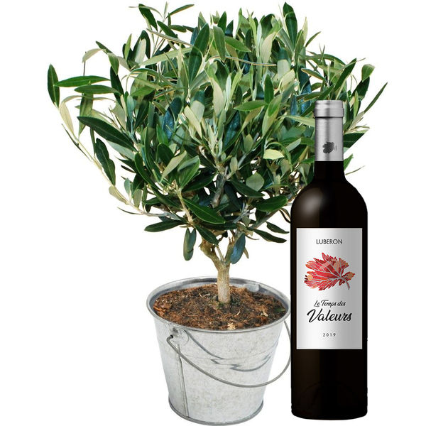 Olivier (hauteur 35cm) dans son pot en zinc rond de 14cm.accompagné de sa bouteille de vin rouge de 75cl du Lubéron