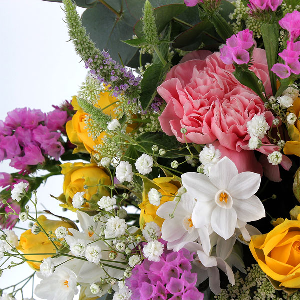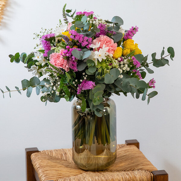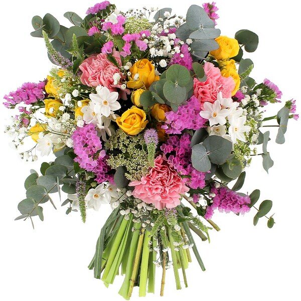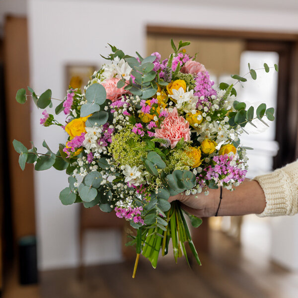 Le bouquet Opéra, subtile alliance de tons roses, jaunes et blancs, séduit par sa diversité florale. Composé d'œillets, de roses, de gypsophile et de fleurettes saisonnières, il offre une symphonie de couleurs. Les branches d'eucalyptus et le feuillage ajoutent une touche de fraîcheur délicate à cet ensemble harmonieux. Opéra, une création florale qui évoque la beauté changeante des saisons avec élégance et grandeur.