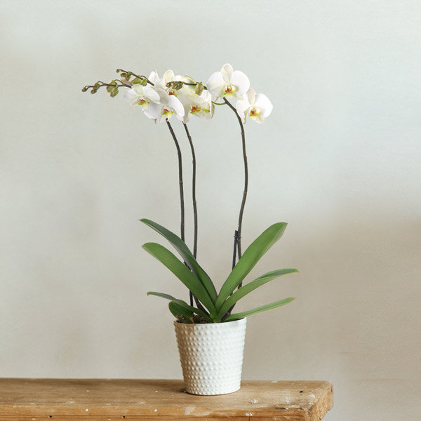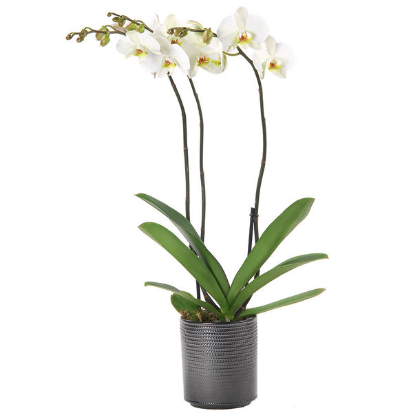Orchidée Phalaenaopsis 3 branches blanche. Le contenant peut varier en fonction des disponibilités du fleuriste en charge de votre commande.