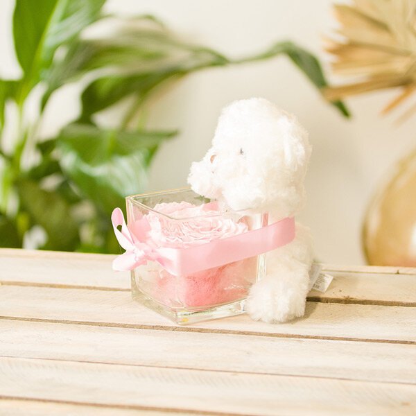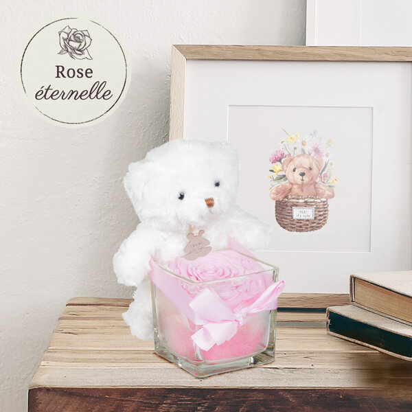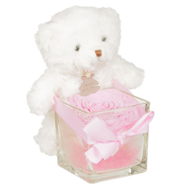 Rose éternelle rose avec pot en verre carré accompagnée de son ourson en peluche Histoire d'Ours (15cm).
