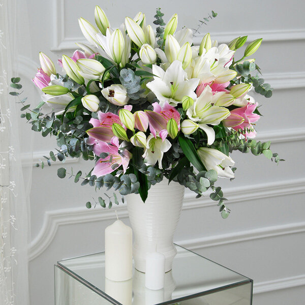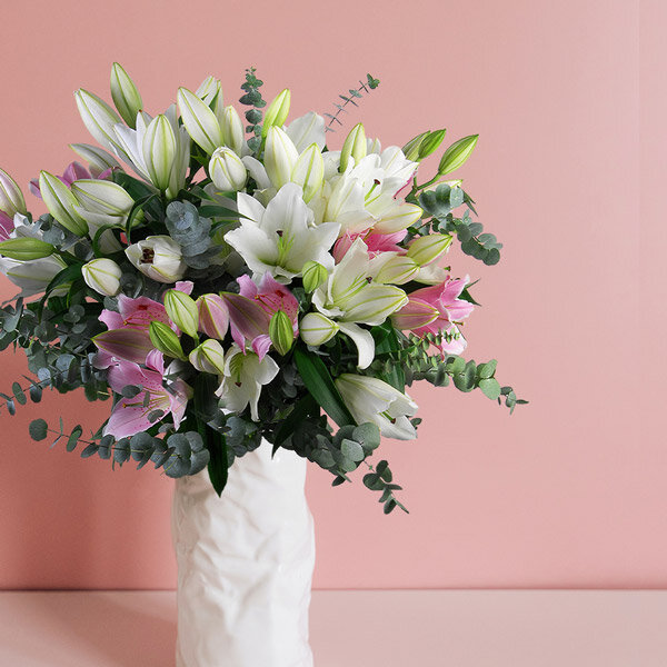 Bouquet rond dans les tons blanc et rose composé de lys et eucalyptus.
