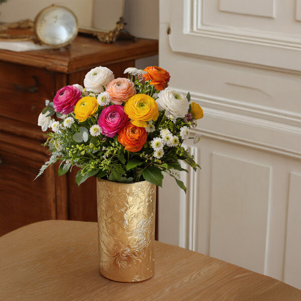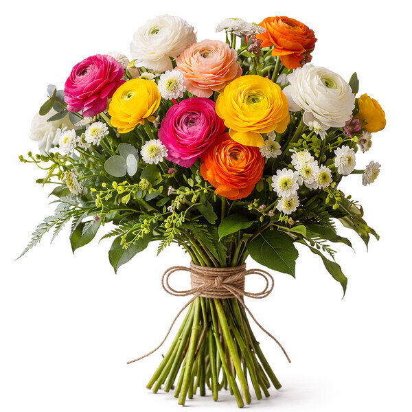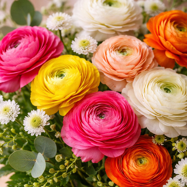 Bouquet coloré composé de renoncules multicolores, de fleurettes blanches et de feuillages.