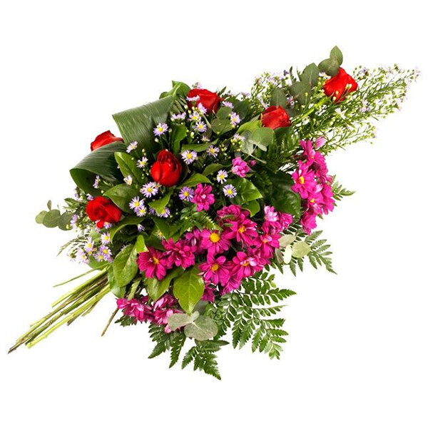 Nous avons aimé cette composition de fleurs tout en contrastes. Son feuillage élégamment travaillé renforce l’ultra sophistication de la rose rouge tandis que le mélange d’asters et de chrysanthèmes apporte un côté bon enfant à cette superbe gerbe. Pour exprimer toute une palette de sentiments des plus tendres au plus profonds lors d'un deuil.