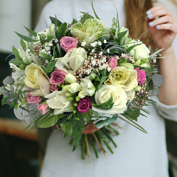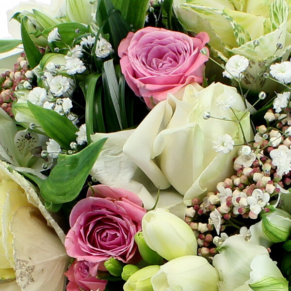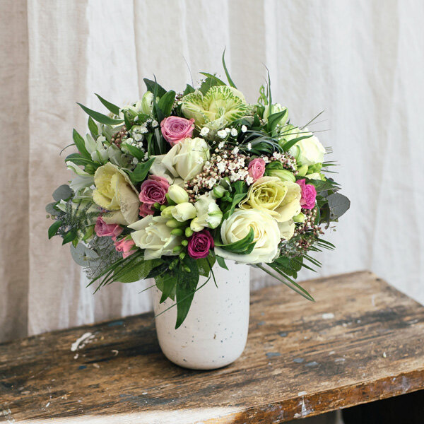 Bouquet rond dans les tons blanc, rose et vert composé de roses, choux, alstromérias, fleurettes et feuillages.