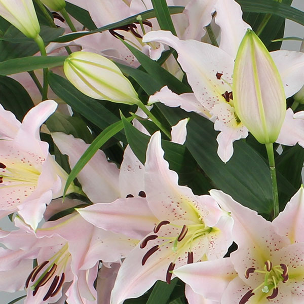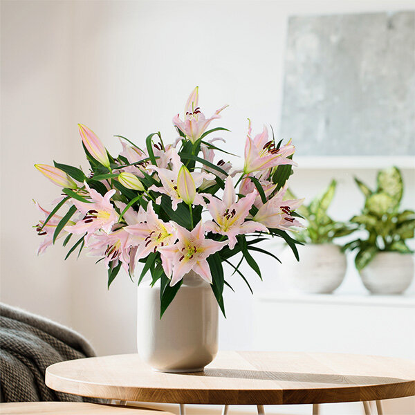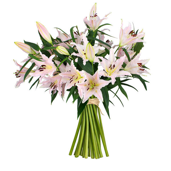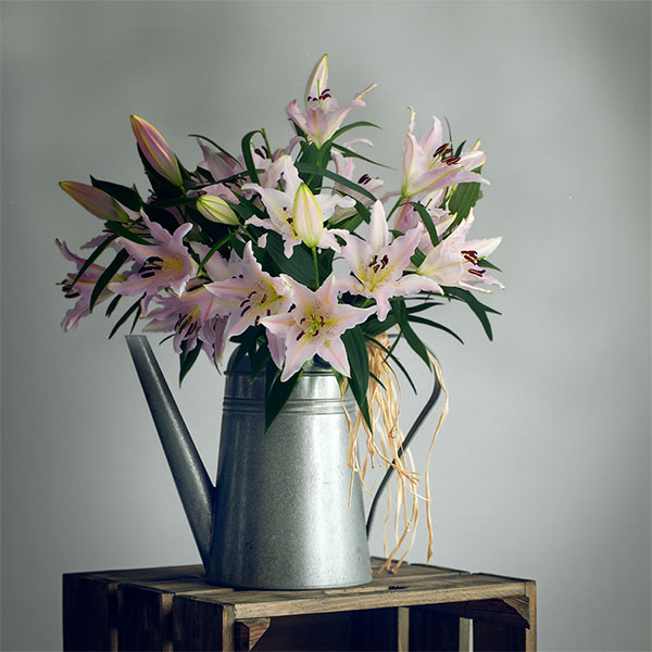 Aérien et élégant le lys séduit par son élégance puis subjugue pas son parfum capiteux. Délicatement rosée, cette sublime brassée de fleurs est un hymne à l’innocence et à la douceur. Parfait en toutes occasions le lys est la reine des fleurs, la fleur des rois !