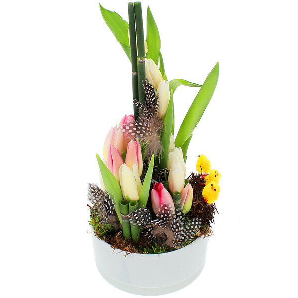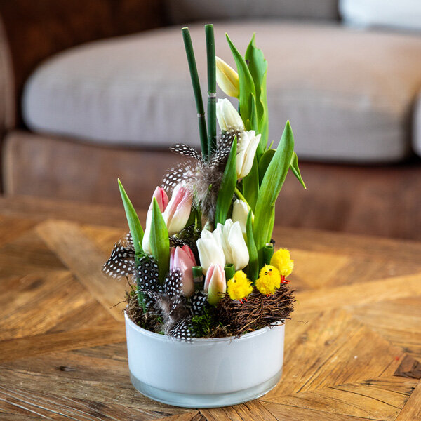 Les cloches résonneront prochainement pour annoncer les festivités de Pâques. Pour cette heureuse occasion, nos artisans fleuristes ont créé avec une attention particulière la composition de Pâques Polito, une œuvre exclusive empreinte de délicatesse, parée de couleurs chatoyantes et de décorations festives. Tel un jardin miniature, Polito s'érige comme le cadeau idéal à offrir ou à orner votre table de repas en ce dimanche pascal, ajoutant une touche florale raffinée à cette journée spéciale.