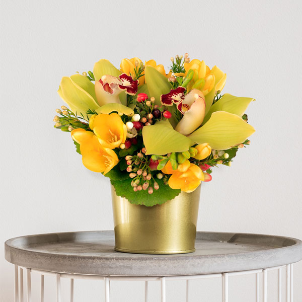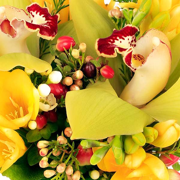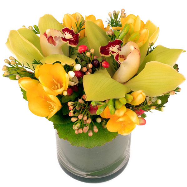 Dans leur petit contenant de verre freesia et cymbidium tournoient dans une élégante danse du printemps sur fond de verdure. Tiercé gagnant pour cette très belle composition qui habillera de grâce les intérieurs les plus raffinés.