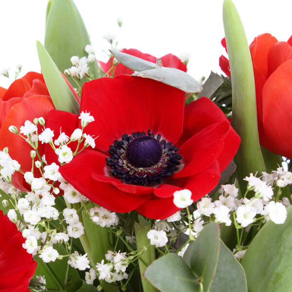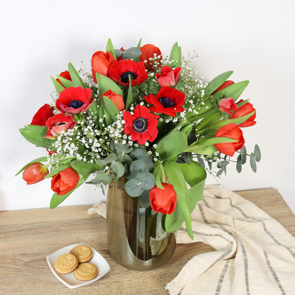 Les tulipes et les anémones rouges forment ce duo qu'on attend chaque printemps. Leur rouge vif réveille la maison après l'hiver, amène cette énergie particulière des premières fleurs fraîches. Les tulipes se tiennent droites, presque sages. Les anémones ondulent légèrement, apportent du mouvement à l'ensemble.