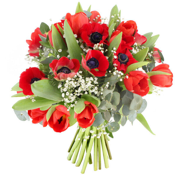 La combinaison tulipes-anémones a ce côté spontané qui change des compositions trop travaillées. On dirait presque qu'elles ont été cueillies le matin même dans un jardin. Cette simplicité dit beaucoup : des sentiments authentiques, vivants, qui évoluent.