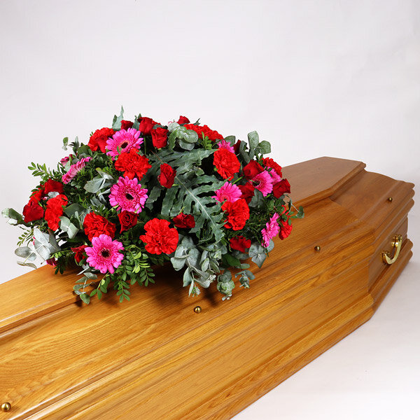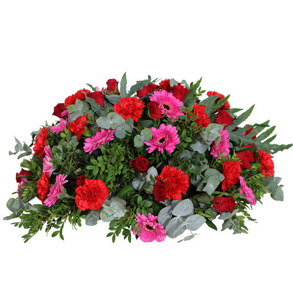 Coussin de deuil dans les tons roses et rouges composée de roses, œillets, fleurettes et feuillages. Le contenant peut varier en fonction des disponibilités du fleuriste en charge de votre commande.