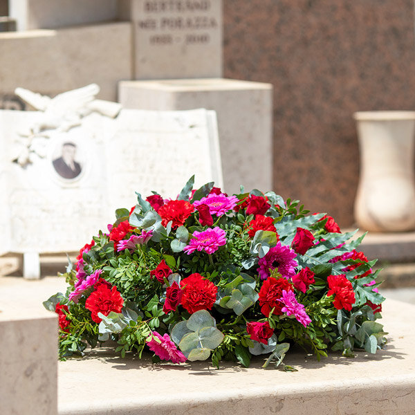 Lors d'un deuil ou d'une commémoration, il est courant pour des amis ou des membres de la famille de s'associer pour offrir une composition florale commune. Un coussin de deuil, tel que le modèle "Recueillement", est souvent choisi car il accompagne le défunt pendant la cérémonie et jusqu'à sa dernière demeure. Ce coussin, composé de fleurs symboliques comme des roses et des œillets, permet d'exprimer de manière collective les sentiments de recueillement et de respect. Grâce à cette composition florale, les proches peuvent représenter leurs diverses émotions et hommages, offrant ainsi une présence réconfortante et significative en ces moments difficiles.