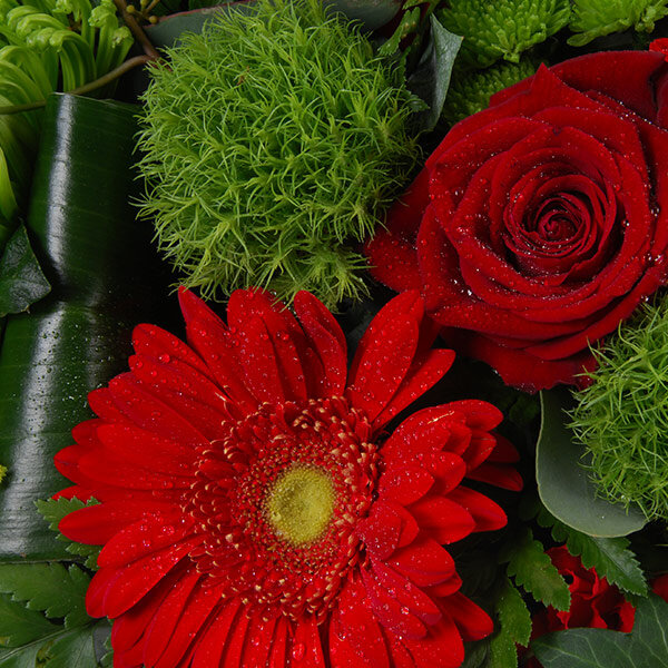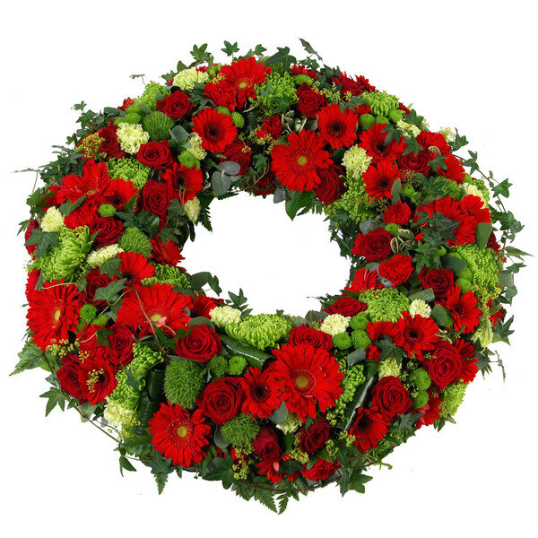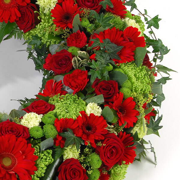 Couronne de deuil dans les tons rouges et verts, composée de gerberas, roses, anastasias et autres fleurs de saison.