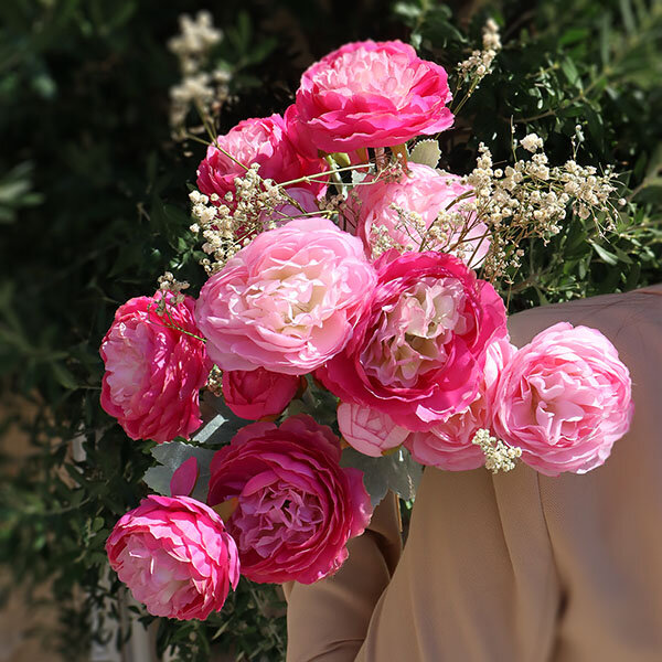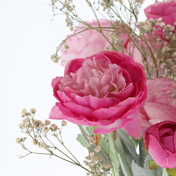 Le bouquet Ballet séduit par l’élégance de ses renoncules artificielles aux pétales soyeux, déclinées dans des nuances raffinées de fuchsia et de rose poudré. Subtilement rehaussé de gypsophile séché, il évoque la délicatesse d’un arrangement floral romantique et intemporel.