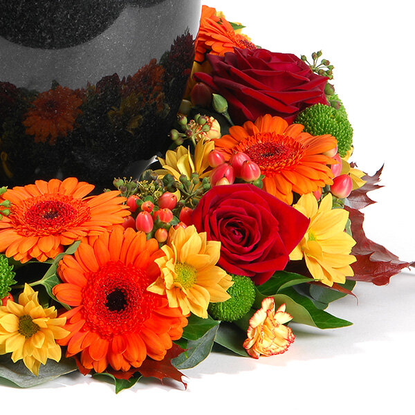 Couronne pour urne de deuil dans les tons orange et rouge, composée de roses, germinis et autre fleurettes de saison. Urne non fournie.