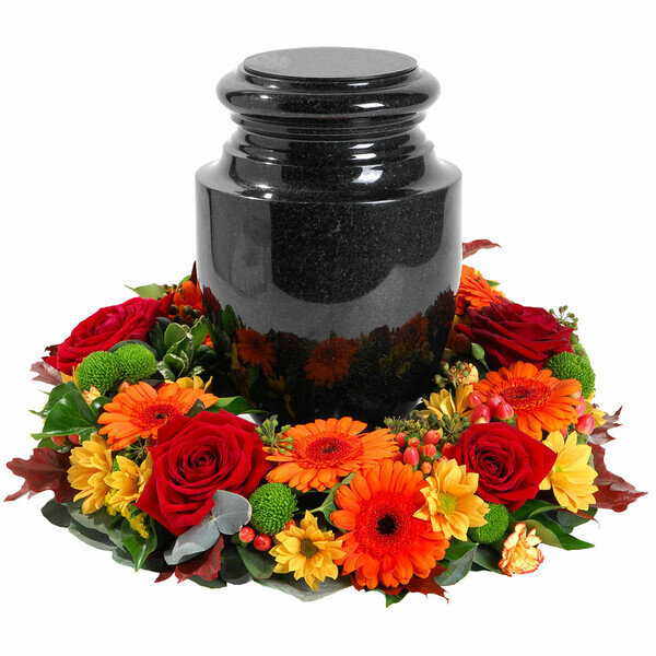Comme une étreinte silencieuse, cette couronne célèbre l’amour et le souvenir d’un être cher, illuminant la cérémonie de sa chaleur et de son éclat. Chaque fleur semble murmurer des mots de tendresse, transformant ce geste en hommage vibrant et délicat. L’urne, laissée au centre, devient le cœur de ce bouquet d’émotions, prêt à fleurir la mémoire de manière intime et sincère.
