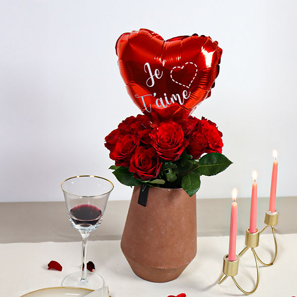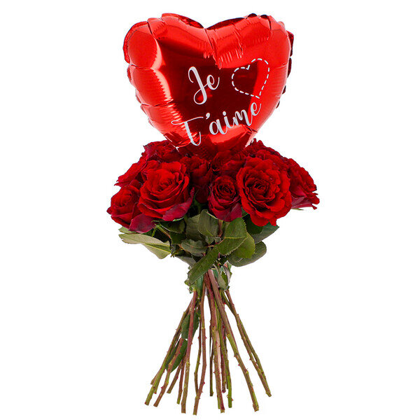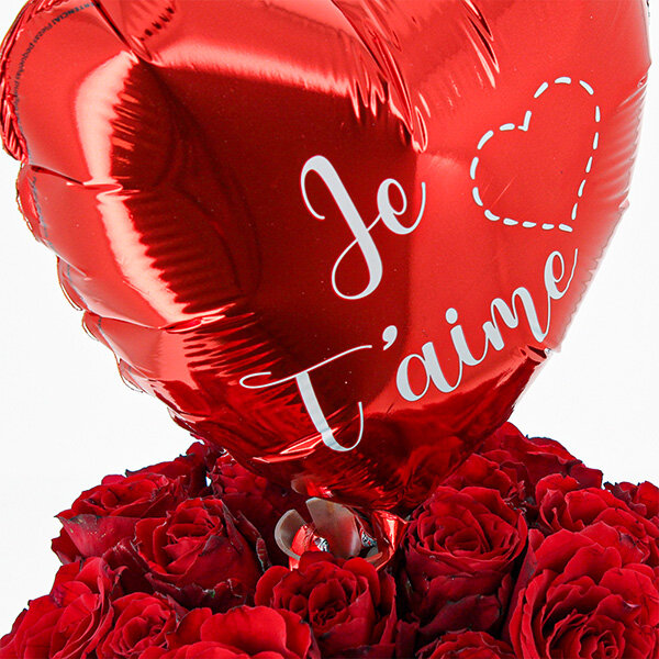 À la recherche du cadeau idéal pour la Saint-Valentin ? Ce bouquet de 20 roses rouges, surplombé d’un ballon en forme de cœur portant l’inscription «?Je t’aime?», fera une impression inoubliable. Ici, tout est dit avec clarté, sans détour. Le rouge des roses exprime l’amour dans ce qu’il a de plus direct : la passion, l’attachement, l’émotion assumée. Les roses, choisies pour la densité de leurs pétales et l’intensité de leur couleur, forment un bouquet équilibré et harmonieux. Le ballon cœur vient naturellement s’élever au centre de la composition. Il apporte une touche légère, presque ludique, qui contraste avec la profondeur des fleurs. Ce dialogue entre le végétal et l’accessoire donne au bouquet une vraie présence.
