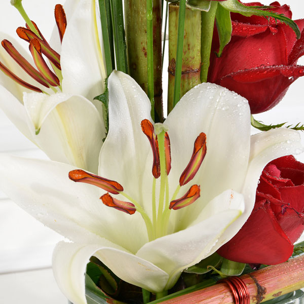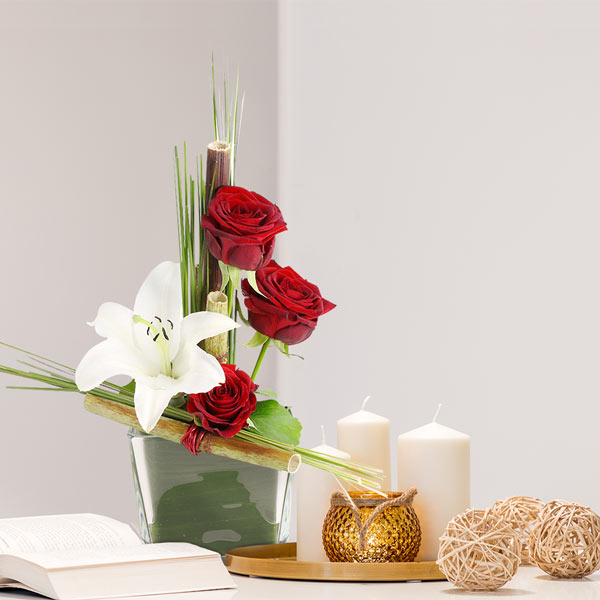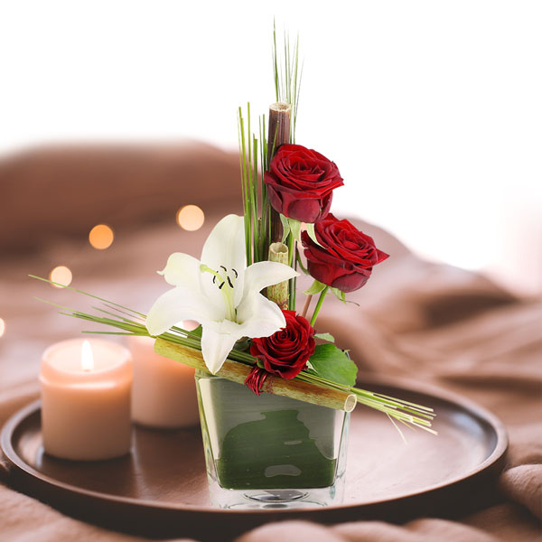 On choisit cette composition quand on veut vraiment marquer le coup. Un anniversaire qui compte, une déclaration qu'on a envie de réussir, une réussite à célébrer dignement. Elle trouve sa place aussi bien dans un salon que sur une table dressée pour la Saint-Valentin, apportant cette touche à la fois classique et vibrante qui traverse les styles de décoration. Le lys va s'ouvrir progressivement au fil des jours, révélant ses étamines dorées, tandis que les roses gardent leur tenue plusieurs jours. Un cadeau qui assume pleinement son intention : celle d'impressionner avec justesse.