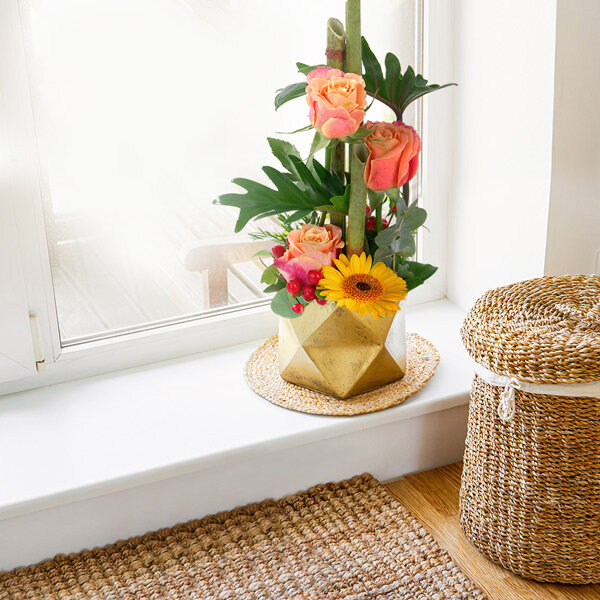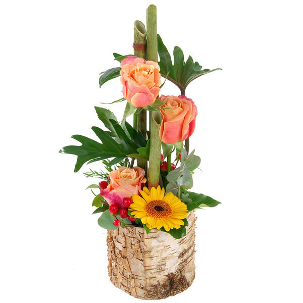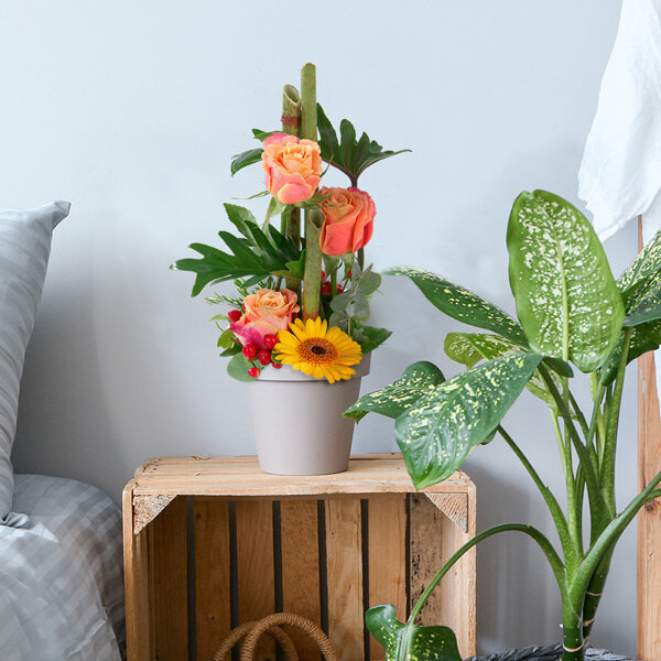 Composition en hauteur dans les tons roses, jaunes et verts réalisée à partir de roses, germinis et feuillages. Le contenant peut varié en fonction de la disponibilité du fleuriste en charge de votre commande.