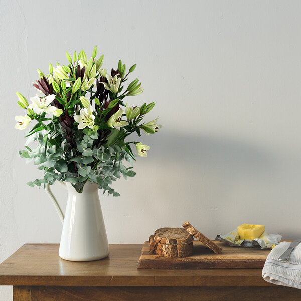 Bouquet longues tiges composé de lys blanc et eucalyptus.