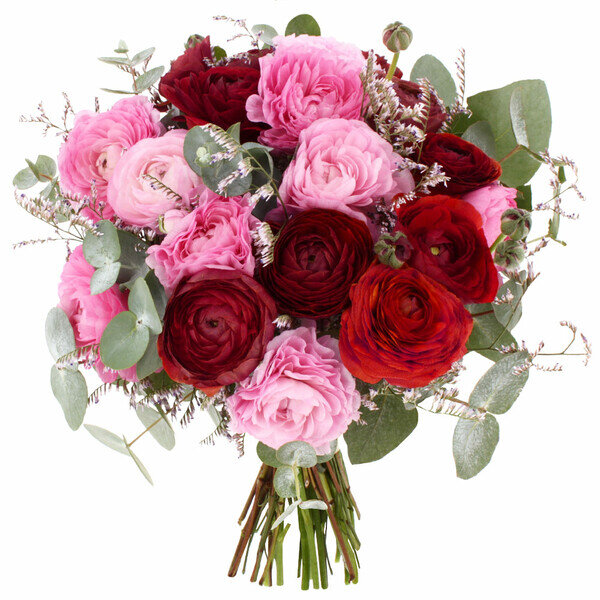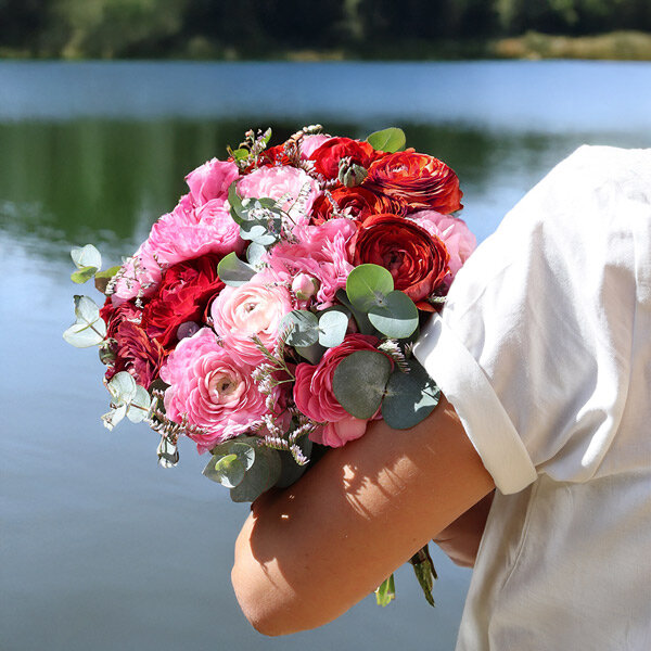 Un bouquet qui porte bien son nom, mélange de rouge intense et de rose doux. Les renoncules ont ces pétales fins qui font penser à du papier froissé, avec l'eucalyptus qui vient rafraîchir l'ensemble. Cette composition joue sur les contrastes : la profondeur du rouge bordeaux face à la légèreté du rose poudré.